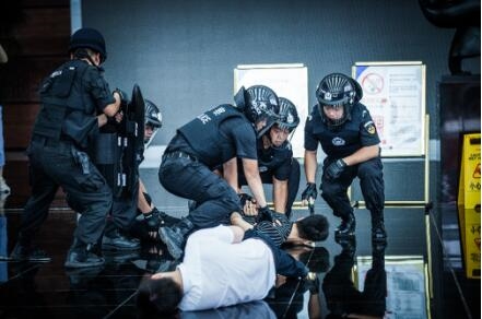 首先进行的是剧院公司华中分公司的保安技能展示团队。他们现场展示了警棍盾牌操、擒拿格斗术、消防服穿戴等岗位技能。在演习环节,现场模拟了演出开场前安检过程中,突遇多名不法分子持刀伤人、挟持人质、纵火及投掷危爆物品的情况。本次演习按照相关预案有序进行,取得了圆满成功。期间,剧院公司还邀请到武汉市公安局反恐支队大队长刘炜进行了反恐防暴专题讲座,组织全体人员观看了《假如暴恐来临》反恐防暴宣导片。